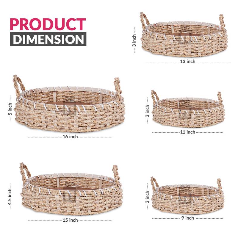 Expertly crafted and versatile, this 5-piece set of Round jute baskets is perfect for gifting on special occasions such as weddings. With varying dimensions ranging from 16×5 to 9×3, these baskets are ideal for adding a touch of rustic charm to any home decor.