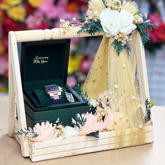 90th Anniversary Gift Basket – Gift for him. The package is beautifully presented in a charming wooden frame, enhanced with delicate floral arrangements, golden mesh, and pearl accents.