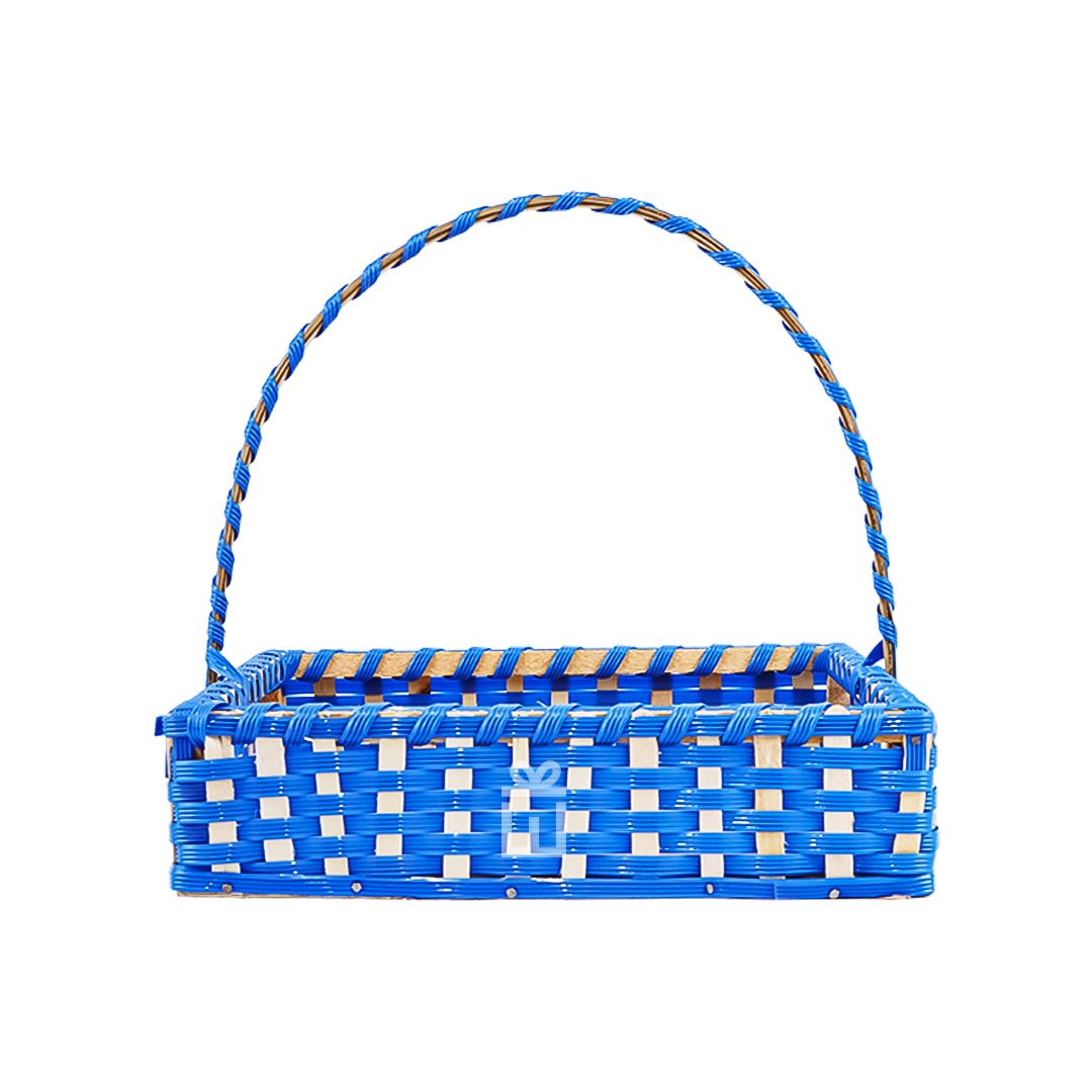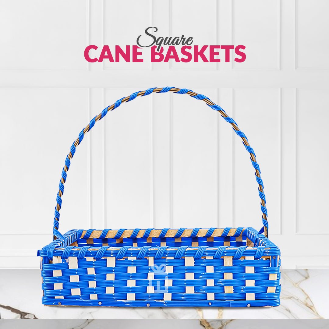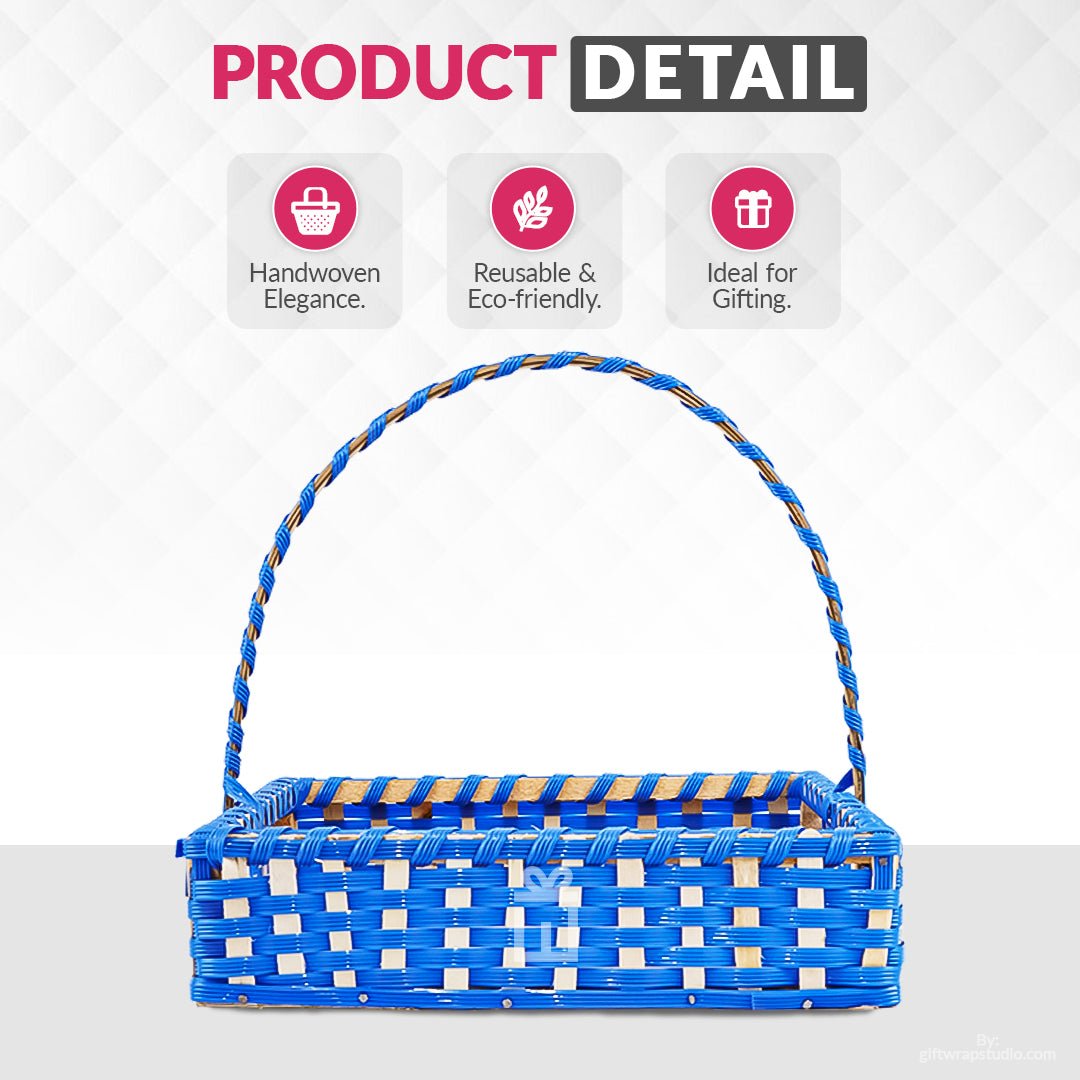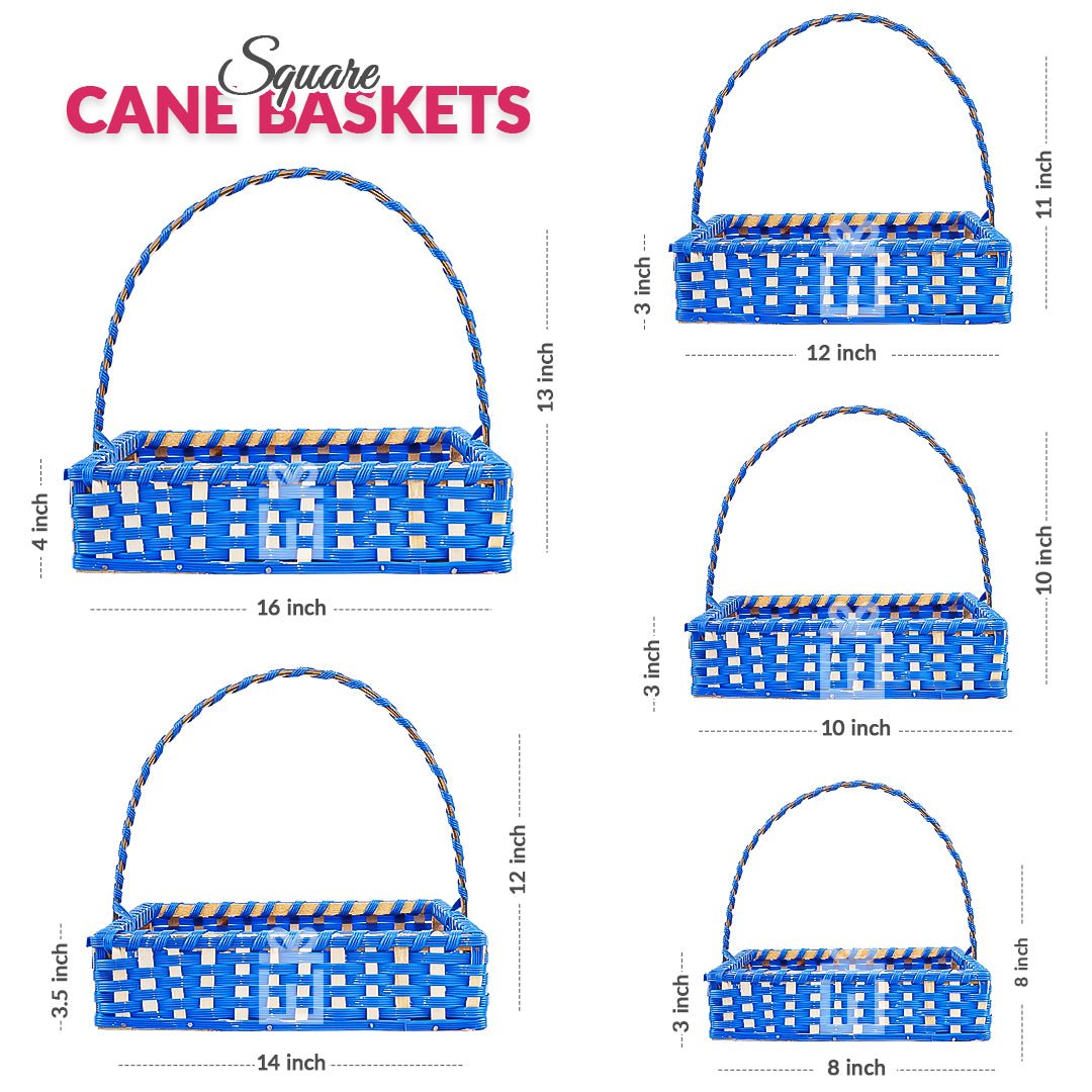 Set of 5 Blue Square Cane Baskets by Giftwrap Studio. Handcrafted from natural cane and lined with soft jute fabric, these versatile baskets are perfect for gifting, home organization, and decorative storage. Their rich coffee brown finish and sturdy build make them ideal for holding gifts, dry items, cosmetics, or home essentials.