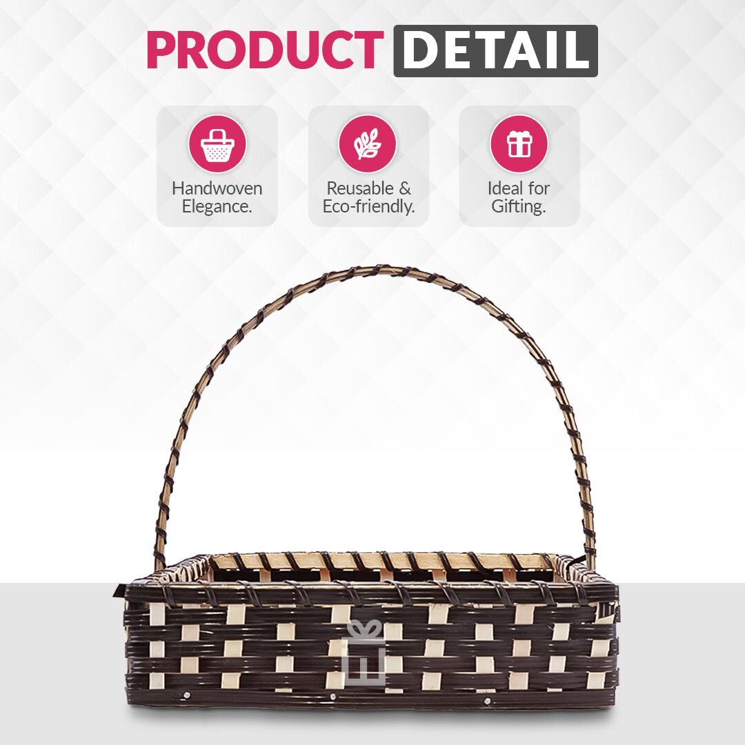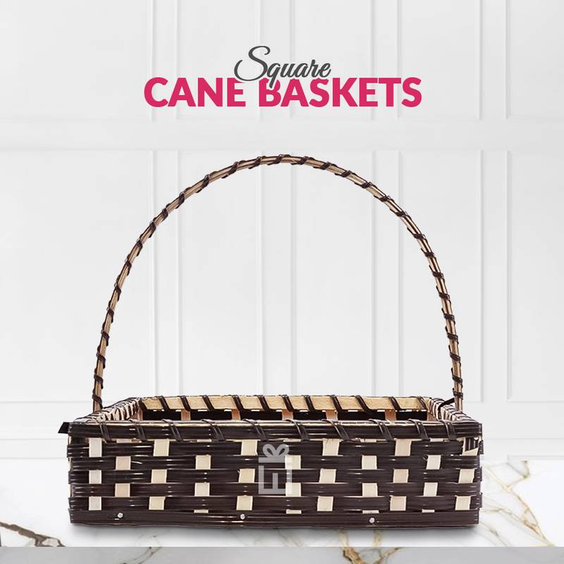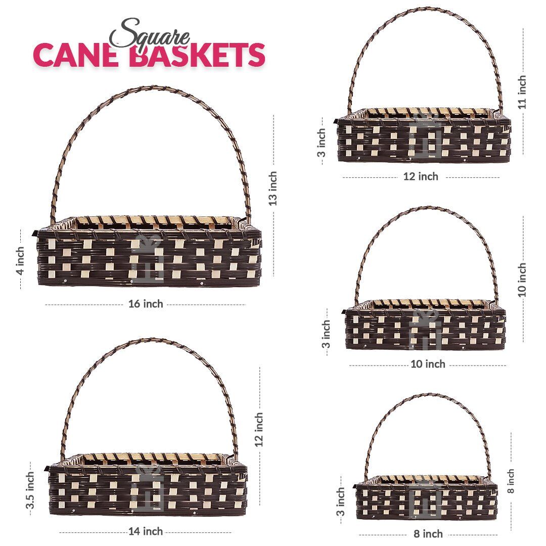 Set of 5 Coffee Brown Square Cane Baskets by Giftwrap Studio. Handcrafted from natural cane and lined with soft jute fabric, these versatile baskets are perfect for gifting, home organization, and decorative storage. Their rich coffee brown finish and sturdy build make them ideal for holding gifts, dry items, cosmetics, or home essentials.
