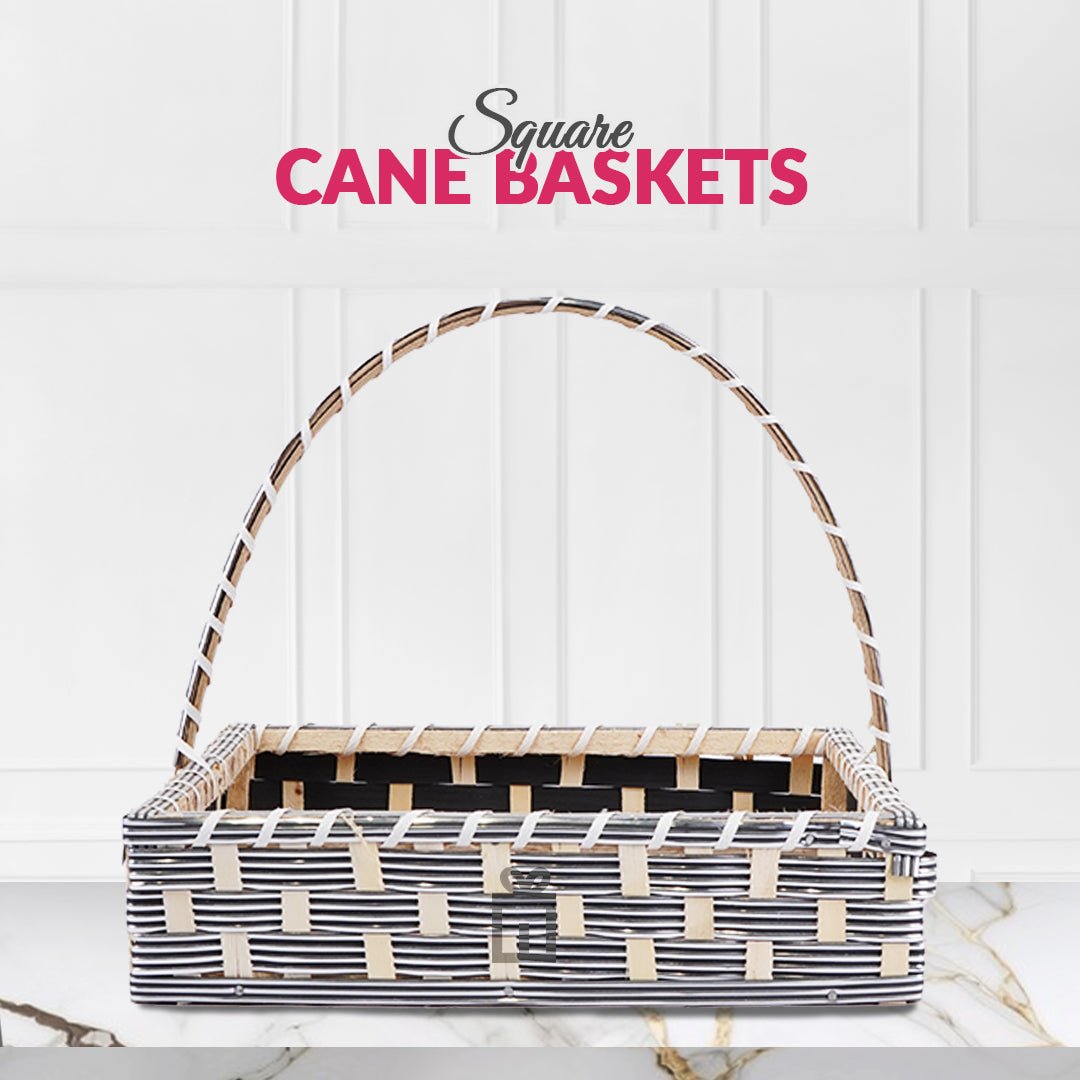 Set of 5 Silver Square Cane Baskets by Giftwrap Studio. Handcrafted from natural cane and lined with soft jute fabric, these versatile baskets are perfect for gifting, home organization, and decorative storage. Their rich coffee brown finish and sturdy build make them ideal for holding gifts, dry items, cosmetics, or home essentials.